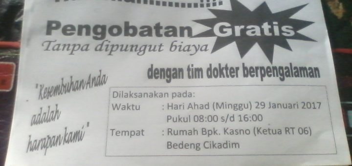 Gambar. Pamflet baksos kesehatan yang disebar di salah satu titik Kampung Laut Sejak beberapa hari lalu, tim medis yang akan...