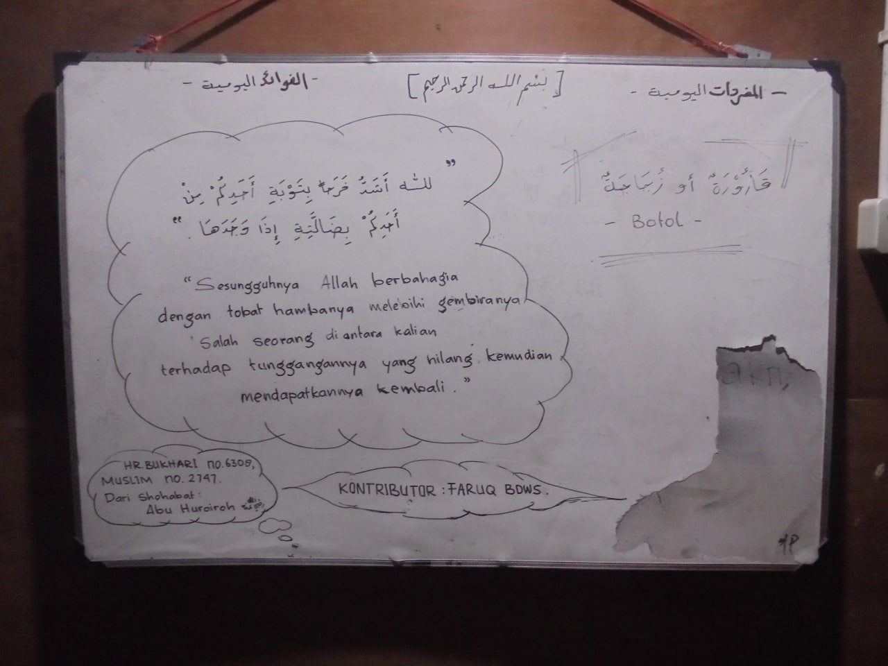 Oh, rupanya hari itu adalah hari pertama Divisi Karya Ilmiah dan Divisi Bahasa Arab Takmili berkarya. Melalui papan tulis kecil di depan kantor Takmili, mereka menuliskan faedah ilmiah dan kosa kata bahasa Arab apa saja yang sekiranya dapat bermanfaat bagi teman-temannya. Sederhana tapi penuh makna. Mereka tak ingin kalah dari Lembaga Takhasus sebagai pendahulunya dengan program-program yang serupa.